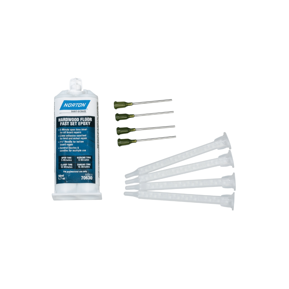 The Norton Fast Set Hardwood Floor Epoxy Kit includes a 50ml, two-part bottle of clear epoxy, four mixing nozzles, and four 1-1/2-in precision needles.