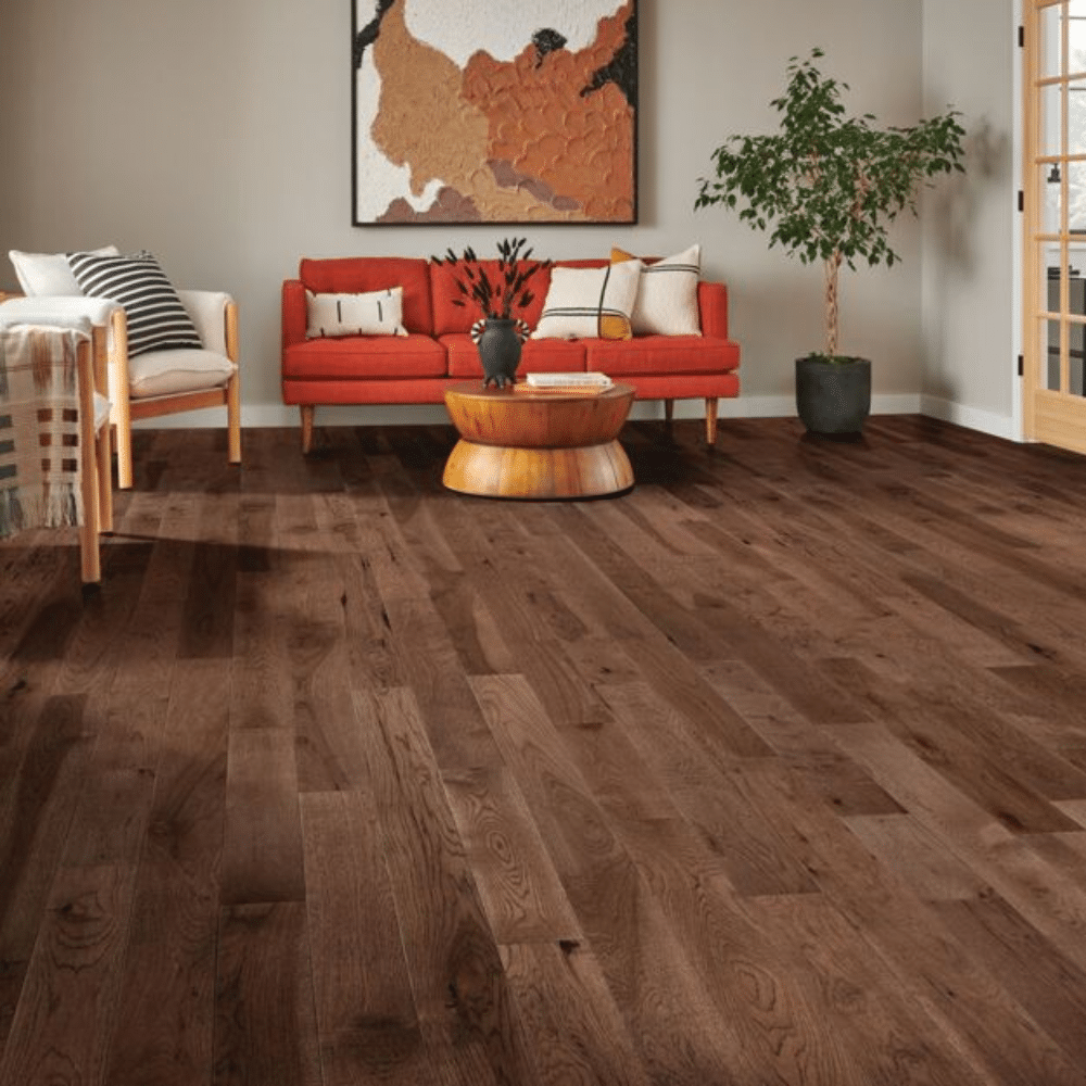 Robbins Natural Forest Smooth Hickory features a traditional finish that highlights the strong grain pattern and natural variation of hickory. The low gloss urethane with aluminum oxide helps protect the surface while keeping a more natural appearance. Solid hardwood construction allows the floor to be sanded and refinished over time for extended use.
